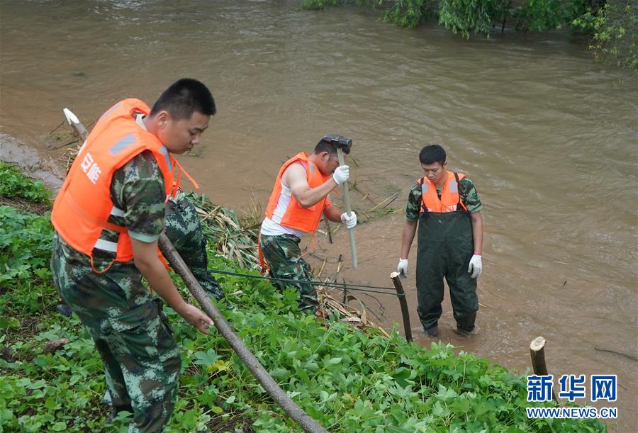 在鎮(zhèn)江市丹徒區(qū)世業(yè)鎮(zhèn)先鋒村西南大堤,中國安能集團(tuán)第二工程局常州分公司防汛前置備勤隊(duì)員在打樁,用來固定捆好的蘆葦(7月17日攝)。捆蘆葦護(hù)邊坡、機(jī)器人進(jìn)涵洞、“養(yǎng)水盆”防滲漏……在江蘇鎮(zhèn)江,當(dāng)?shù)馗刹咳罕姾蛯I(yè)力量,因地制宜就地取材,老辦法搭配新技術(shù),一批險(xiǎn)情得以消除在萌芽狀態(tài)。新華社記者季春鵬攝