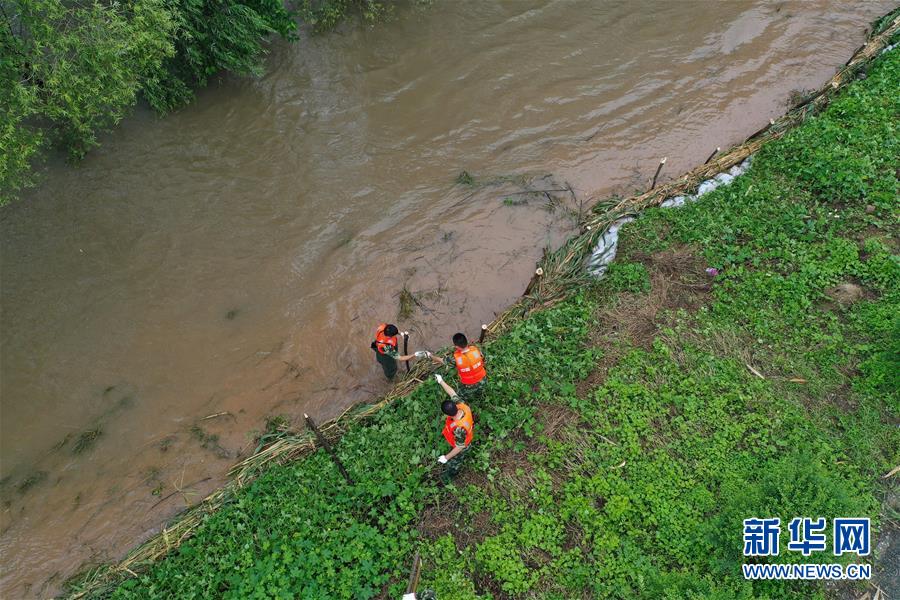 在鎮(zhèn)江市丹徒區(qū)世業(yè)鎮(zhèn)先鋒村西南大堤,中國安能集團(tuán)第二工程局常州分公司防汛前置備勤隊(duì)員在捆蘆葦護(hù)邊坡(7月17日攝)。捆蘆葦護(hù)邊坡、機(jī)器人進(jìn)涵洞、“養(yǎng)水盆”防滲漏……在江蘇鎮(zhèn)江,當(dāng)?shù)馗刹咳罕姾蛯I(yè)力量,因地制宜就地取材,老辦法搭配新技術(shù),一批險(xiǎn)情得以消除在萌芽狀態(tài)。新華社記者季春鵬攝
