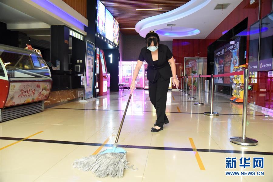 7月20日,濟(jì)南新世紀(jì)電影城陽(yáng)光100店的員工在對(duì)影院設(shè)施進(jìn)行消殺。當(dāng)日,山東濟(jì)南市部分電影院在嚴(yán)格防控疫情的基礎(chǔ)上陸續(xù)恢復(fù)開放。新華社記者王凱攝