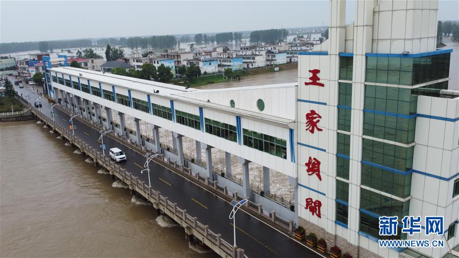 這是7月22日在安徽省阜南縣拍攝的淮河王家壩閘(無(wú)人機(jī)照片)。7月22日14時(shí),淮河王家壩水位降至28.73米,超警戒水位1.23米,低于保證水位0.57米。新華社記者張端攝
