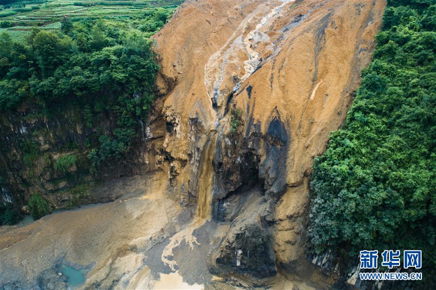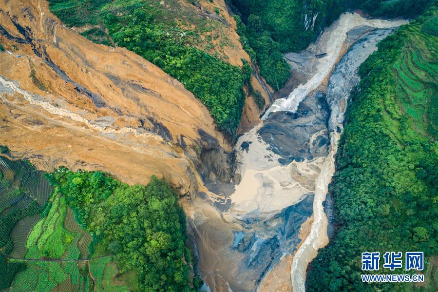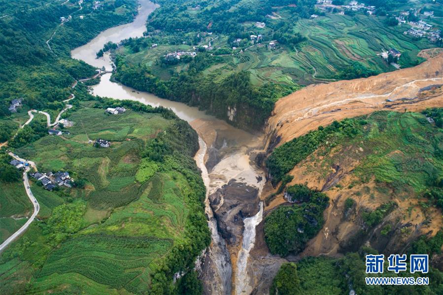 7月22日拍攝的因恩施州屯堡鄉(xiāng)馬者村山體滑坡形成的堰塞湖(無人機(jī)照片)。