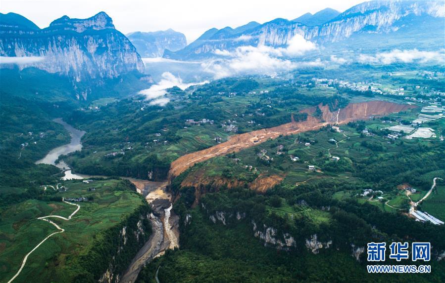 7月22日拍攝的因恩施州屯堡鄉(xiāng)馬者村山體滑坡形成的堰塞湖(無人機照片)。新華社記者肖藝九攝