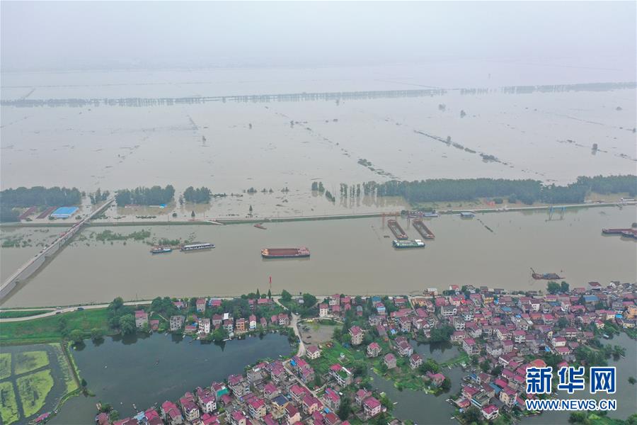 這是7月21日拍攝的被淹的南京市高淳區(qū)陽江鎮(zhèn)勝利圩(畫面左側(cè))(無人機照片)。新華社記者季春鵬攝
