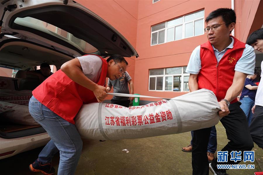 7月23日,工作人員在盱眙縣鮑集小學安置點搬運帳篷。當日,受淮河盱眙段水位上漲影響,江蘇省淮安市盱眙縣啟動鮑集圩行洪區(qū)萬余名群眾撤離轉(zhuǎn)移工作,確保安全度汛。新華社記者韓瑜慶攝