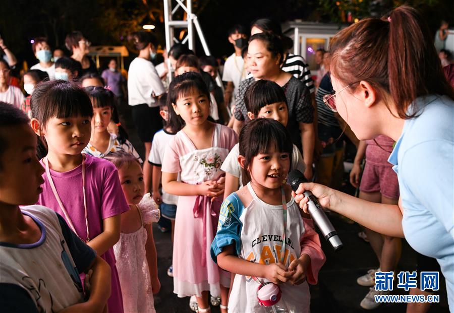 7月23日晚,在成都市成華區(qū)望平街濱河路的天府文創(chuàng)大集市上,參加讀書活動的小朋友在介紹自己閱讀過的童話故事。新華社記者 王曦 攝