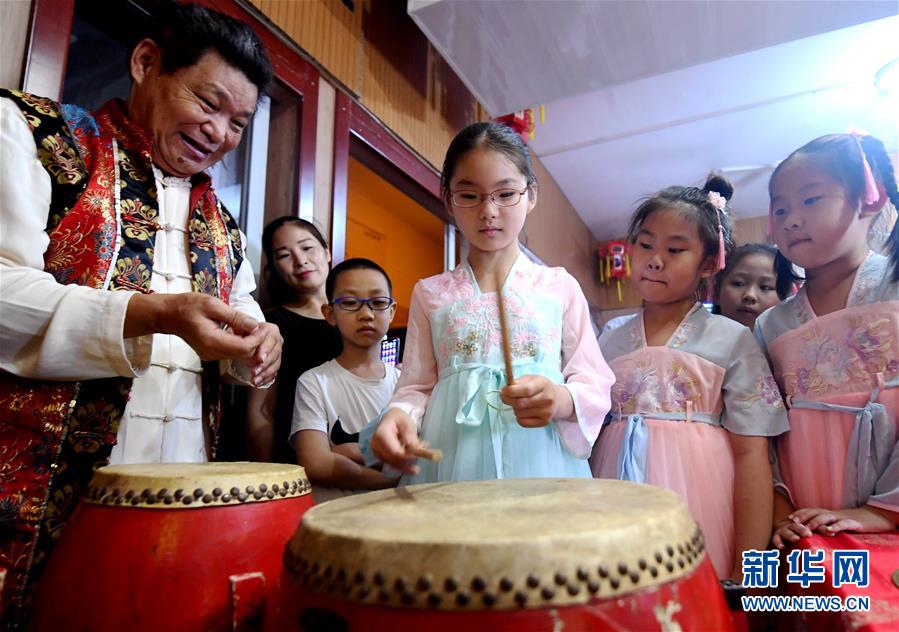 7月26日,在石家莊市橋西區(qū)休門街道休門西街社區(qū),休門吹歌傳承人付錫芬(左一)在指導(dǎo)小朋友敲鼓技巧。當(dāng)日,河北省石家莊市橋西區(qū)暑期“非遺”小課堂開班。河北省級(jí)非物質(zhì)文化遺產(chǎn)休門吹歌傳承人走進(jìn)休門街道休門西街社區(qū),為轄區(qū)小朋友講解休門吹歌歷史,傳授非遺技藝,豐富他們的暑期生活。新華社記者 王曉 攝