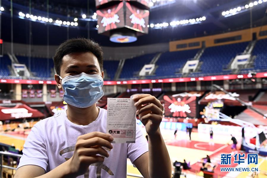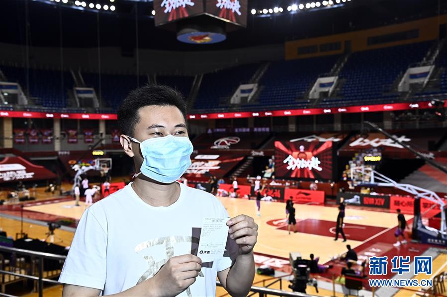 7月26日,在青島國(guó)信體育館,蘇柯帆展示自己的CBA電子票。他成為CBA聯(lián)賽復(fù)賽允許觀眾現(xiàn)場(chǎng)觀賽后,首位進(jìn)場(chǎng)的觀眾。當(dāng)日,在山東青島舉行的2019-2020賽季中國(guó)男子籃球職業(yè)聯(lián)賽(CBA)復(fù)賽第二階段(嶗山賽區(qū))比賽中,醫(yī)護(hù)人員、教師、公安戰(zhàn)線人士通過(guò)官方購(gòu)票平臺(tái),完成包括核酸檢測(cè)在內(nèi)的相關(guān)流程后進(jìn)場(chǎng)觀看了上海久事隊(duì)迎戰(zhàn)山東西王隊(duì)的比賽。觀賽期間,觀賽者須全程佩戴口罩,對(duì)號(hào)入座,嚴(yán)格保持間隔一米就座。退場(chǎng)時(shí),觀眾須按照自后向前、先兩邊后中間的順序,保持“一米線”社交距離有序退場(chǎng)。新華社記者 郭緒雷 攝