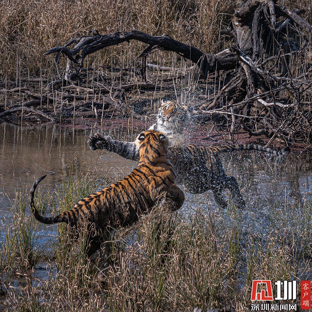 2020年7月27日,猛虎斗有多壯觀?來自印度德里的41歲職業(yè)業(yè)攝影師Nitish Madan,在在印度北部倫滕波爾國家公園游覽時(shí),見證了兩只老虎幼崽激烈的水上爭(zhēng)奪戰(zhàn)。從畫面中可以看到,兩只足足有200磅重的孟加拉虎,面對(duì)面互相咆哮,伸出虎爪兇猛至極,才15個(gè)月大就已經(jīng)有了王者風(fēng)范。
