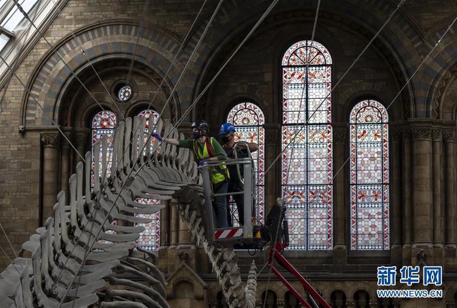 7月27日,工作人員在英國倫敦的自然歷史博物館大廳內(nèi)清潔一具藍(lán)鯨骨架。受新冠疫情影響關(guān)閉數(shù)月的英國自然歷史博物館將于8月5日重新對外開放,目前館方正在為重新開放做最后準(zhǔn)備。參觀者需要提前預(yù)約參觀時(shí)段、全程佩戴口罩且保持安全距離。新華社記者韓巖攝