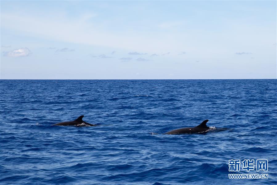 這是7月20日在南海某海域拍攝的弗氏海豚與短肢領(lǐng)航鯨共游場(chǎng)景,后面的黑影為短肢領(lǐng)航鯨。新華社記者張麗蕓攝