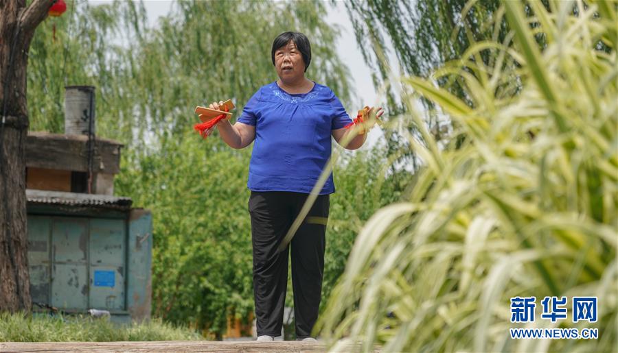 草廠四條居民丁淑鳳在北京市東城區(qū)三里河練習打快板(6月8日攝)。新華社記者馬曉冬攝