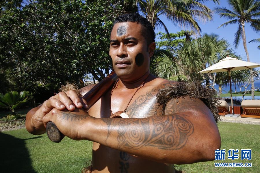 7月21日,在斐濟首都蘇瓦附近的納努庫奧博格海邊度假村,一名斐濟“武士”迎接游客。