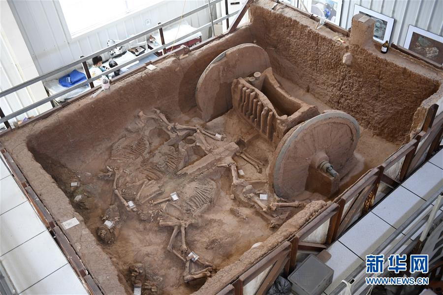 這是7月30日在陜西省考古研究院涇渭基地拍攝的西周晚期青銅輪牙馬車。經(jīng)過文物保護人員3年多連續(xù)不斷的保護修復(fù),一套總長超過3米的西周晚期青銅輪牙馬車已保護和復(fù)原完畢。這套青銅輪牙馬車2014年出土于陜西省寶雞市岐山縣周原遺址,馬車長3.13米、寬2.7米、高1.5米,車頭部位有4匹馬的遺骸。馬車車廂裝飾華麗繁復(fù),有大量鑲嵌綠松石的青銅構(gòu)件、薄壁青銅獸面裝飾以及玉器和彩繪構(gòu)件,車輪外沿全部由青銅鑄造而成,這也是目前唯一一套部件完整的青銅輪牙馬車。根據(jù)實驗室提取的遺物和精確數(shù)據(jù),考古工作者按照原來的工藝、結(jié)構(gòu)對這輛青銅輪牙馬車進行了同比例復(fù)原。這套青銅輪牙馬車的保護和復(fù)原,對研究西周晚期的禮儀及車輿制度有重要價值。新華社記者李一博攝