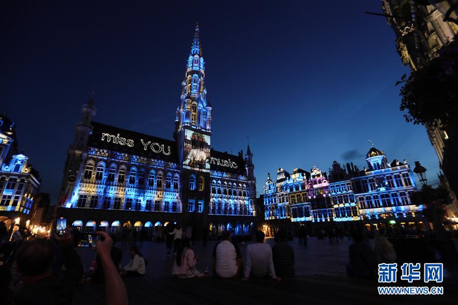 7月29日,人們?cè)诒壤麜r(shí)布魯塞爾大廣場(chǎng)欣賞聲光秀,市政廳外墻上投射出“想念你,音樂”的字樣。7月29日,比利時(shí)布魯塞爾大廣場(chǎng)舉行大型聲光秀。藝術(shù)家在市政廳等歷史建筑上投影文字和圖案,紀(jì)念這個(gè)夏天受新冠疫情影響而不能如期舉辦的文化活動(dòng)。新華社記者鄭煥松攝