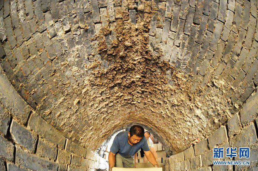 7月30日,河北省任丘市出岸鎮(zhèn)古建磚廠工人將磚坯裝窯以備燒制。新華社記者牟宇攝