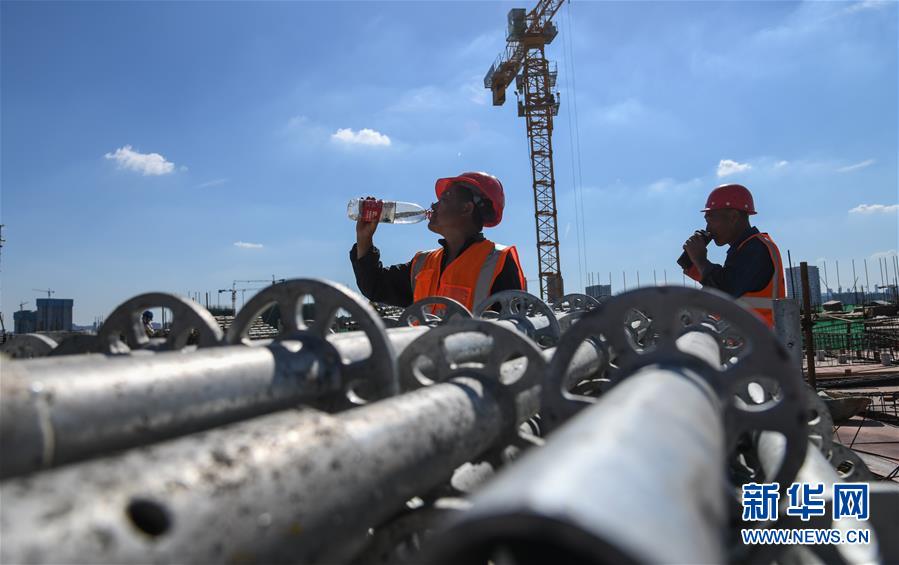 8月3日,工人在長江文創(chuàng)產(chǎn)業(yè)園項(xiàng)目工地休息喝水。進(jìn)入8月,武漢迎來持續(xù)高溫天氣。在湖北廣電傳媒基地工程的工地上,中建三局總承包公司1500多名工人持續(xù)奮戰(zhàn),力保工程進(jìn)度。該工程是我國中部地區(qū)首個(gè)國家級廣播影視媒體基地,由湖北廣電傳媒大廈項(xiàng)目、長江文創(chuàng)產(chǎn)業(yè)園項(xiàng)目、廣電生活配套項(xiàng)目三大板塊組成,總建設(shè)規(guī)模130萬平方米。自今年3月25日獲批正式復(fù)工以來,承建方克服困難,把因疫情影響耽誤的工期趕了回來,預(yù)計(jì)將按原計(jì)劃完成建設(shè)任務(wù)。新華社記者程敏攝