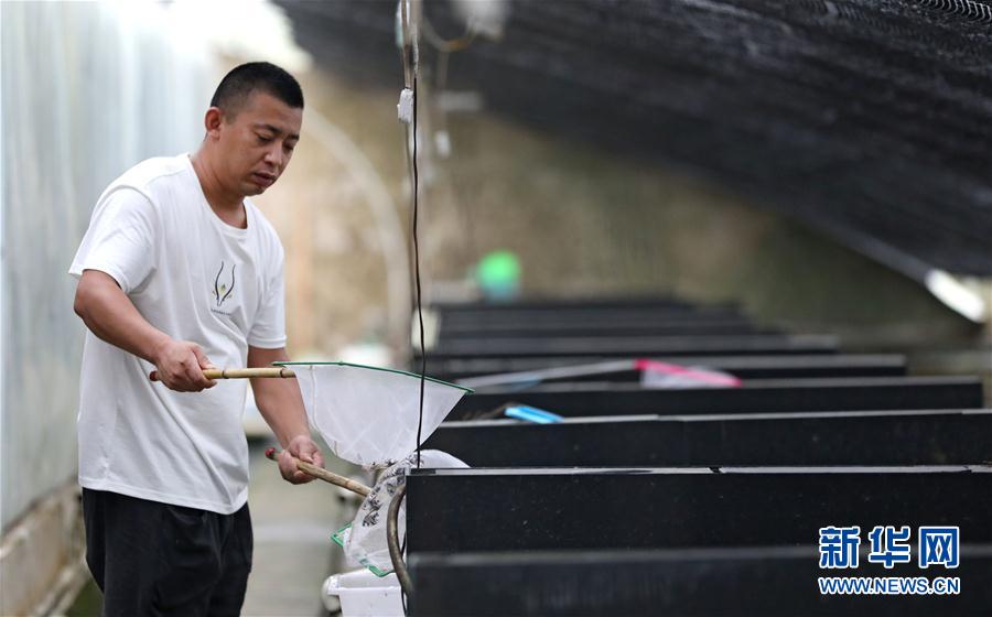8月4日,張忠堡村村民趙世龍在觀察育種筐里的觀賞魚排卵狀況。新華社記者姚劍鋒攝