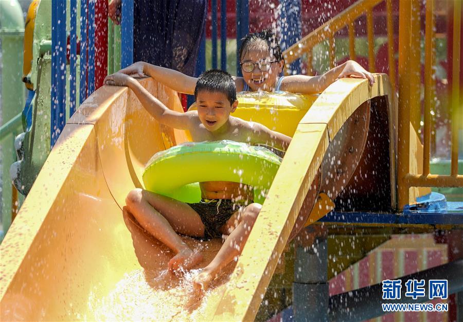 8月5日,重慶涪陵紅酒小鎮(zhèn)水上樂園內(nèi),市民在體驗水上游樂項目。當日,重慶市氣象臺再次發(fā)布“高溫橙色預(yù)警信號”,重慶大部分海拔400米以下地區(qū)日最高氣溫將升至37℃以上,局地可達40℃以上。許多重慶市民涌進當?shù)氐乃蠘穲@和泳池,在水中享受夏季的清涼。新華社記者劉潺攝