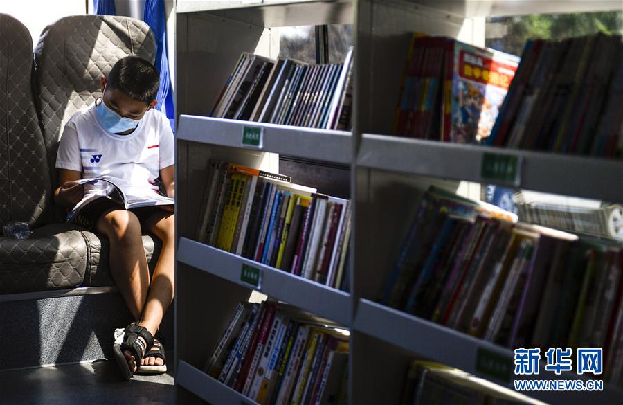8月5日,小讀者在“流動圖書館”里看書。三千冊圖書,一輛大巴車,穿梭在城市的街頭巷尾。在吉林長春,長春市圖書館利用流動圖書車,定期在市內(nèi)15個固定服務點間巡回流動,為市民提供便捷的圖書借閱服務。新華社記者許暢攝