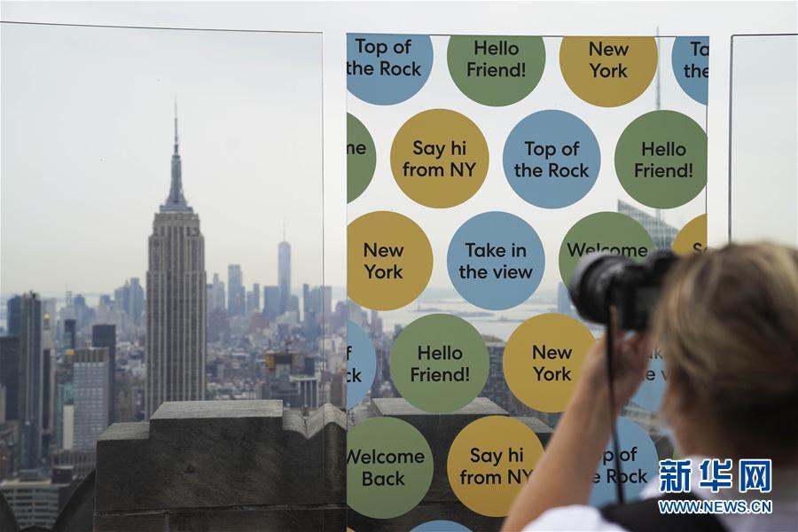 8月6日,在美國紐約,一名攝影師在洛克菲勒中心觀景臺上拍攝城市景觀。當日,3月份暫時關(guān)閉的洛克菲勒中心觀景臺恢復對公眾開放。每天13時至21時,人們可戴口罩前往參觀。新華社記者王迎攝