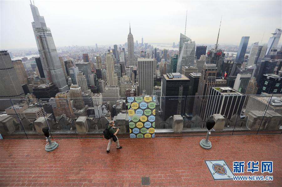 8月6日,在美國紐約,一名攝影師在洛克菲勒中心觀景臺上參觀。當日,3月份暫時關(guān)閉的洛克菲勒中心觀景臺恢復對公眾開放。每天13時至21時,人們可戴口罩前往參觀。新華社記者王迎攝