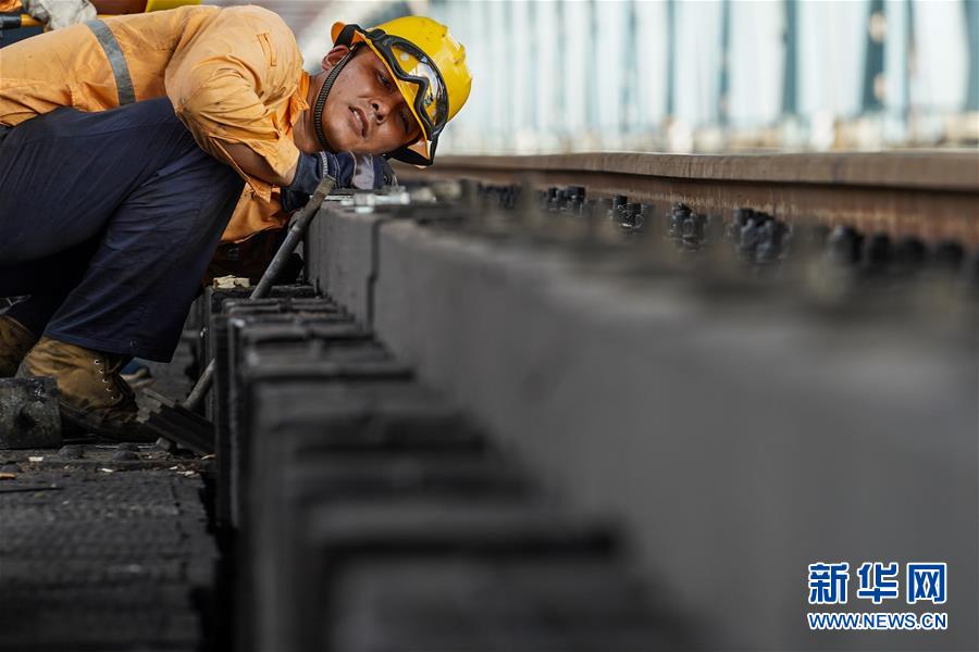 8月6日,一位橋隧工在南京長(zhǎng)江大橋作業(yè)點(diǎn)拆螺桿。新華社記者李博攝