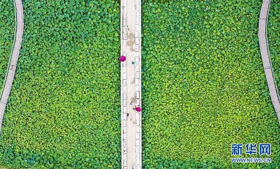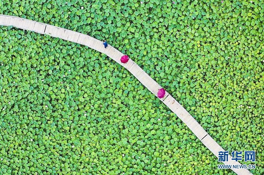 8月6日,游客在河北省永清縣里瀾城鎮(zhèn)金華湖觀賞荷花。夏日時節(jié),河北省永清縣里瀾城鎮(zhèn)金華湖荷塘的荷花爭相開放,吸引市民和游客前來游玩觀賞。新華社記者李曉果攝