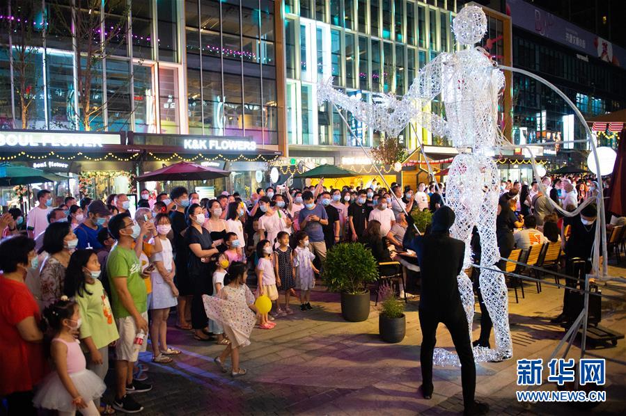 8月8日晚,市民在望京小街商業(yè)街觀看巨型人偶表演。當(dāng)日,作為北京消費(fèi)季活動的一部分,北京市朝陽區(qū)的“潮朝陽”消費(fèi)季活動正式重啟,位于朝陽區(qū)的新興商業(yè)街望京小街舉辦開街嘉年華活動。新華社記者 陳鐘昊 攝