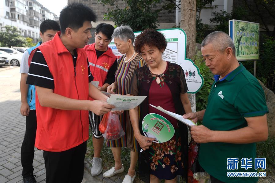 8月9日,湖州市吳興區(qū)八里店鎮(zhèn)志愿者(左)在百合苑小區(qū)向居民介紹生活垃圾定點(diǎn)投放的注意事項(xiàng)。近年來(lái),浙江省通過(guò)創(chuàng)新宣傳教育,多措并舉促進(jìn)垃圾分類(lèi)投放、收運(yùn)及處置的良性循環(huán),引領(lǐng)垃圾分類(lèi)成為城鄉(xiāng)居民的生活新風(fēng)尚。新華社記者黃宗治攝。