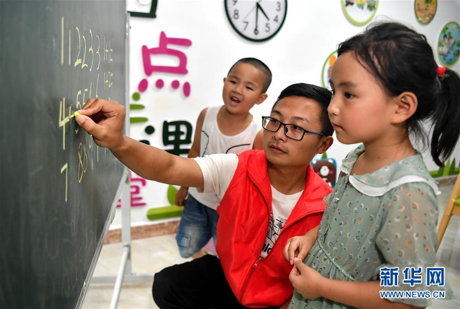 陜西安康市嵐皋縣城關鎮(zhèn)城北易地扶貧搬遷安置小區(qū)“四點半課堂”的老師在輔導孩子們學習數字(7月29日攝)。地處秦巴山區(qū)的嵐皋縣山多溝深,群眾居住分散,長期以來易地搬遷成為這里脫貧攻堅的重點。為避免易地搬遷群眾就業(yè)不充分、辦事不方便、管理不到位等問題,嵐皋縣依托市場完善社區(qū)生活、醫(yī)療、教育、娛樂等服務設施,并開展技能培訓、開辦社區(qū)工廠,讓搬遷居民“穩(wěn)得住”“能致富”。新華社記者劉瀟攝。