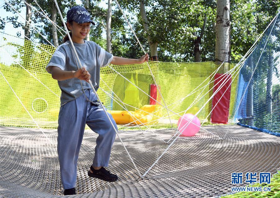 8月9日,市民在南宮五洲植物樂園體驗“叢林網(wǎng)繩”。近期,在做好新冠肺炎疫情防控的前提下,位于北京市豐臺區(qū)的南宮五洲植物樂園戶外戲水區(qū)對外開放。市民在戲水的同時還可以在沙灘上畫沙畫、在新游樂項目“叢林網(wǎng)繩”里穿梭跳躍,豐富暑期生活。新華社記者任超攝。