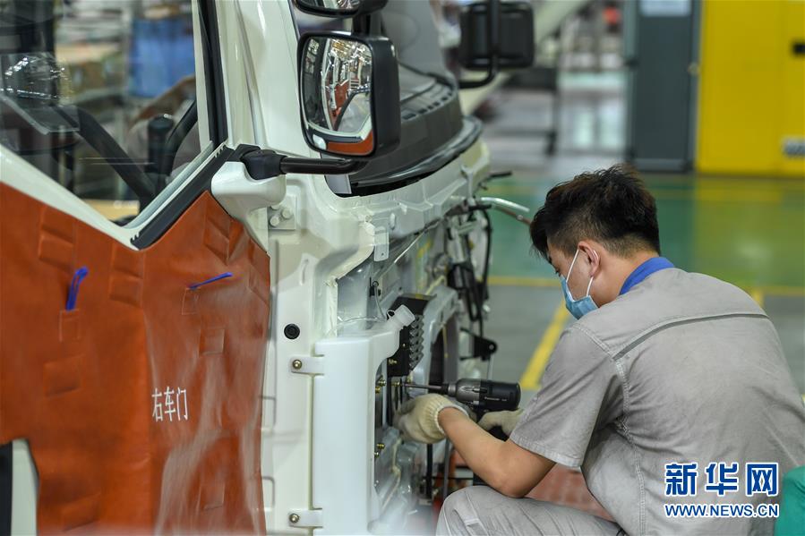 8月10日,在位于長(zhǎng)春市的一汽解放總裝車間,工人在裝配車輛。中國(guó)第一汽車集團(tuán)有限公司7月銷售整車32.2萬輛,同比增長(zhǎng)23.2%,延續(xù)上半年的增長(zhǎng)態(tài)勢(shì)。新華社記者張楠攝。