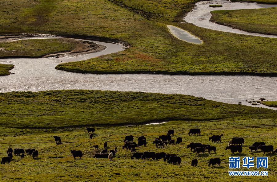 一群牦牛在泥拉壩濕地里徜徉覓食(8月9日攝)。新華社記者江宏景攝。