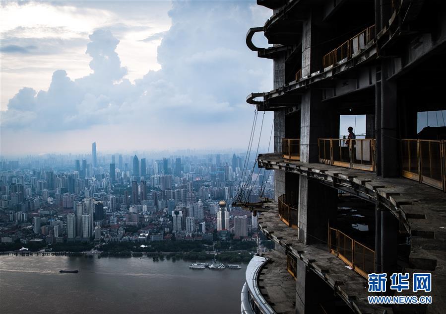 8月11日,工人在武漢綠地中心項(xiàng)目建設(shè)現(xiàn)場(chǎng)近500米的高空施工。新華社記者肖藝九攝