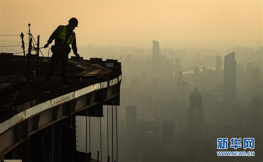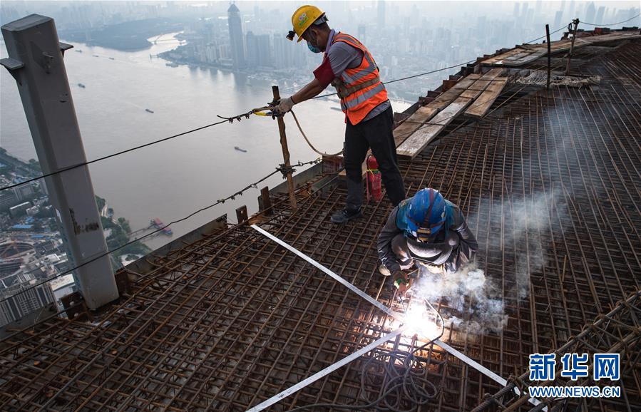 8月11日傍晚,工人在武漢綠地中心項(xiàng)目建設(shè)現(xiàn)場(chǎng)近500米的高空施工。新華社記者肖藝九攝
