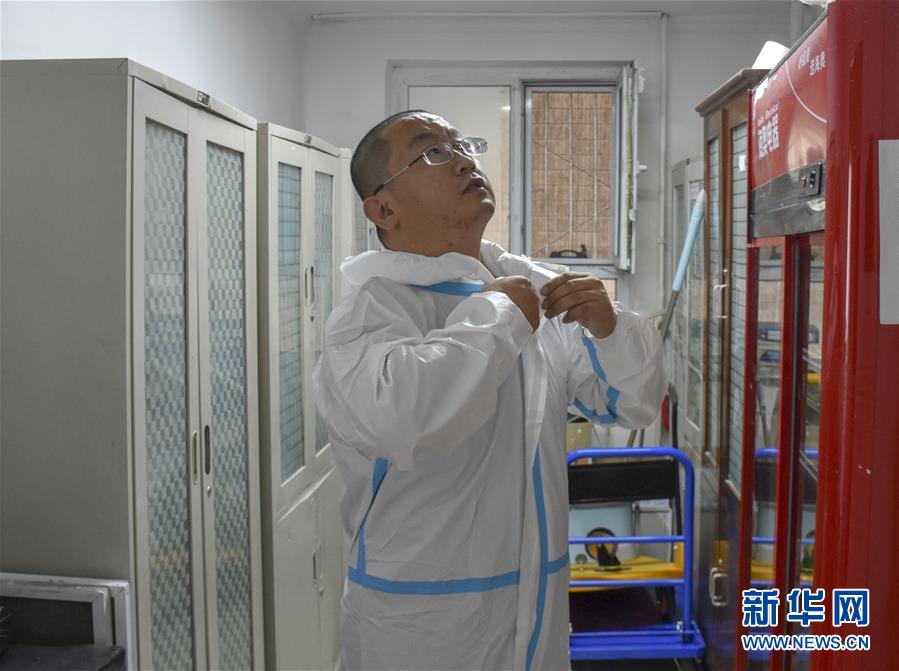 8月12日,烏魯木齊市天山區(qū)山西巷社區(qū)工作人員王志鷹在穿防護服。新華社記者 高晗 攝
