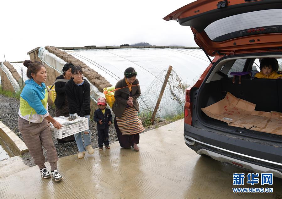 格桑旺姆(左三)和姐姐德吉卓瑪(左一)帶領(lǐng)工人將大棚出產(chǎn)的新鮮蔬菜抬上汽車,準備運往店鋪銷售(8月3日攝)。新華社記者 李賀 攝