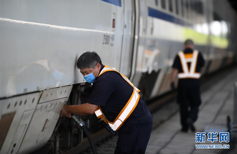 8月12日,長春火車站客運車間上水工王軍在給列車上水。進入暑運高峰,為了保障列車正常用水,每當(dāng)一列火車??寇囌荆L春火車站的上水工就冒著酷暑將水管插進火車底部的輸水口,快速準確完成輸水作業(yè)。新華社記者 林宏 攝