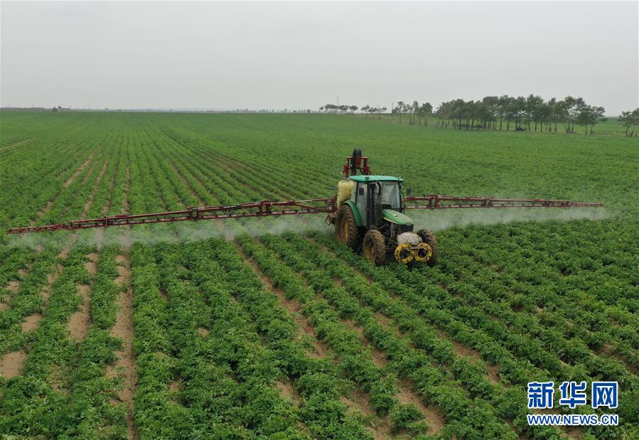 8月12日,在尚義縣三工地鎮(zhèn)有德元村,農(nóng)民使用機(jī)械設(shè)備在田間給旱作馬鈴薯噴灑農(nóng)藥(無(wú)人機(jī)照片)。
