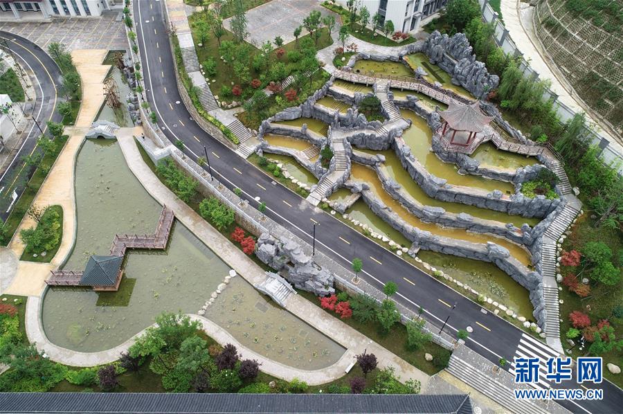 鎮(zhèn)安縣鎮(zhèn)安中學多級瀑布群與水池棧道涼亭景觀(7月30日攝,無人機照片)。新華社記者邵瑞攝