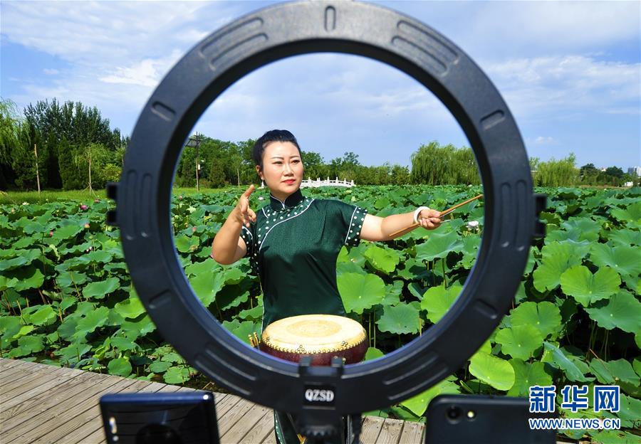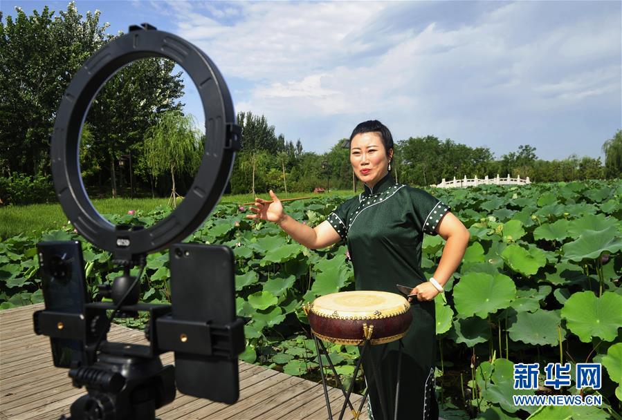8月13日,河北省河間市西河大鼓非遺項目藝人李雪通過網(wǎng)絡(luò)直播表演西河大鼓。暑假期間,河北省河間市文化館推出非遺展演“云端”播系列活動,組織當?shù)匚骱哟蠊姆沁z項目傳承人利用視頻直播的方式進行線上展演,通過“云端”傳承非遺文化。新華社記者朱旭東攝