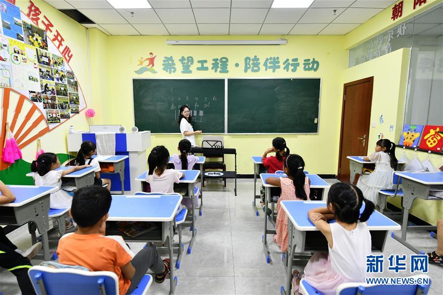 8月13日,在貴州省思南縣雙塘街道麗景社區(qū)易地扶貧搬遷安置點(diǎn),志愿者在給孩子們上音樂課。今年暑假期間,在貴州省銅仁市思南縣雙塘街道麗景社區(qū)易地扶貧搬遷安置點(diǎn),來自北京有研集團(tuán)和思南當(dāng)?shù)氐闹驹刚邆兝檬钇跁r(shí)間,給安置點(diǎn)的孩子們進(jìn)行音樂、體育、手工、安全教育等課程輔導(dǎo),幫助搬遷戶照看孩子,讓孩子們在學(xué)習(xí)中度過一個(gè)快樂而有意義的暑假。新華社記者楊文斌攝