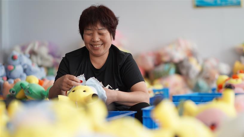 7月13日,河北省內丘縣一家玩具生產企業(yè)工人在加工毛絨玩具。