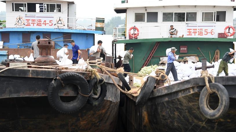 7月14日,當?shù)卮迕裢簧习徇\砂石袋。當?shù)胤姥床块T組織船只裝載砂石袋等防汛物資,運往圩堤保防汛。