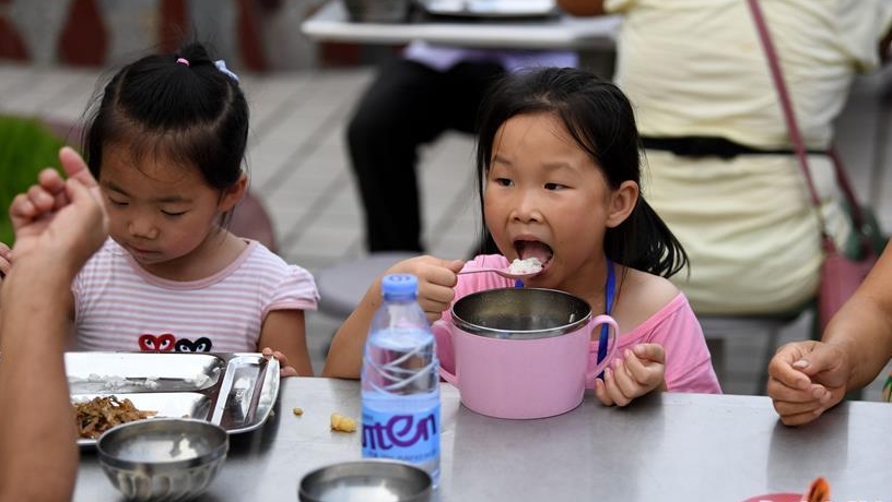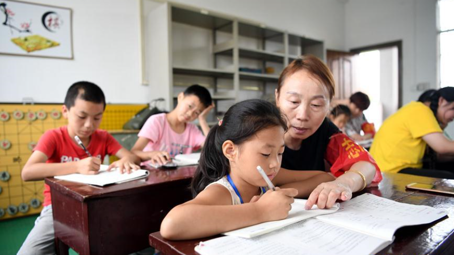7月16日,在安徽省宿松縣洲頭鄉(xiāng)中心小學集中安置點,教師志愿者輔導孩子們完成暑假作業(yè)。