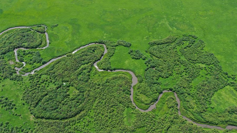7月2日,在黑龍江省五大連池市的草原上,桑慶軍在三輪車(chē)上拋撒飼料喂雞。
