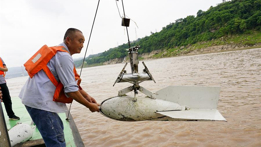 7月2日,在水文作業(yè)船上,長(zhǎng)江清溪場(chǎng)水文站工作人員將水樣采集鉛魚(yú)放入水中。