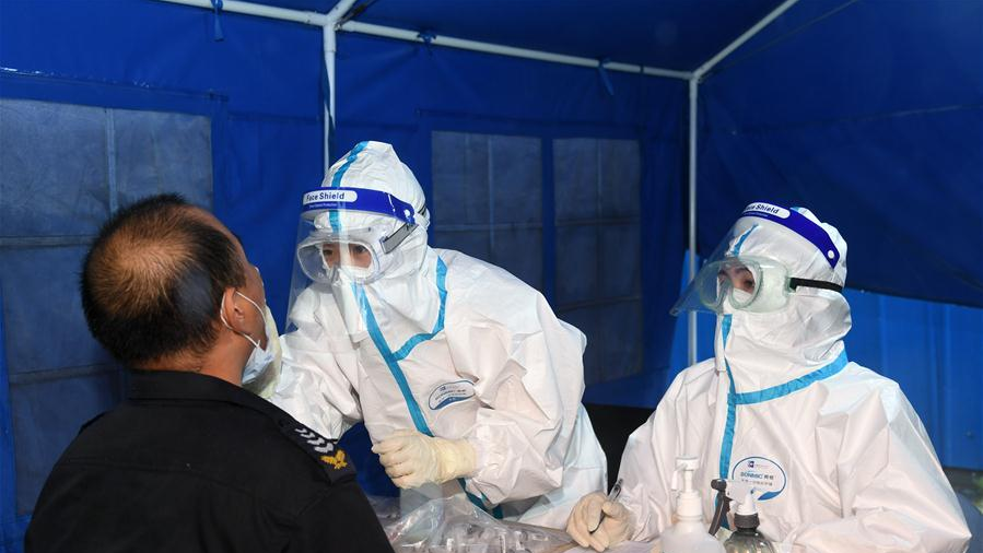 6月18日,在海淀區(qū)區(qū)級核酸檢測采樣點,醫(yī)護(hù)人員為市民進(jìn)行核酸檢測采樣。