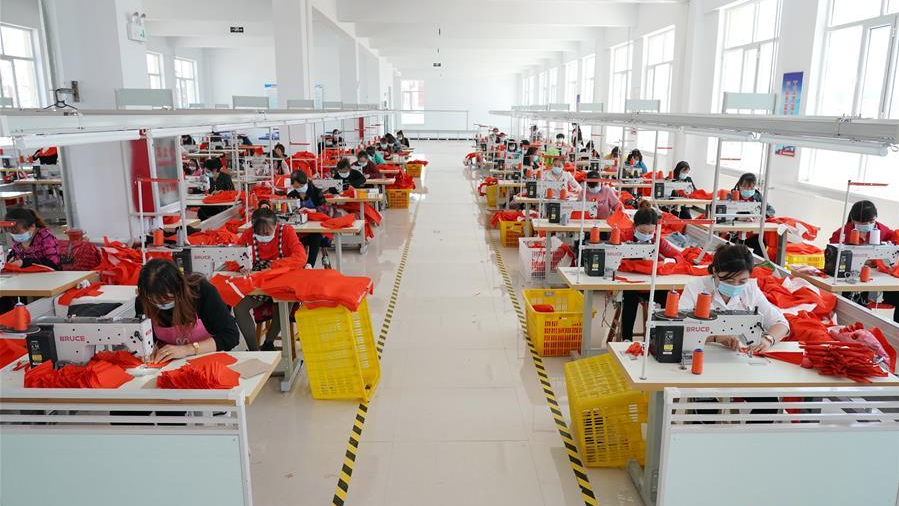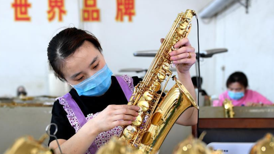 6月2日,工人在武強縣一家樂器廠生產車間內組裝薩克斯。