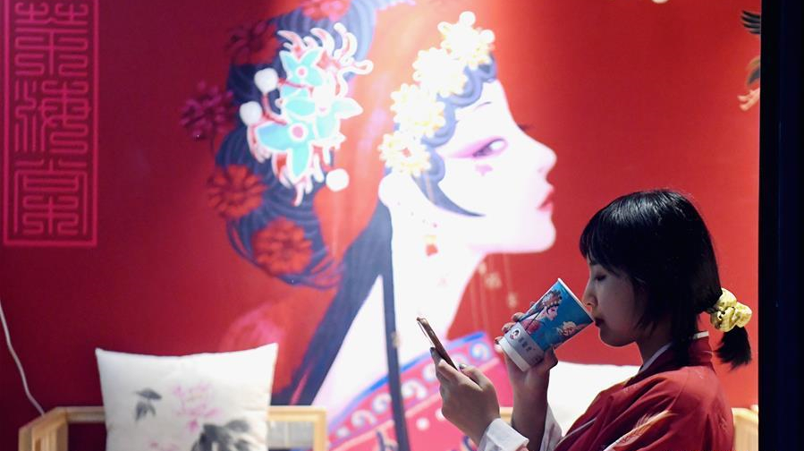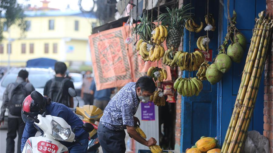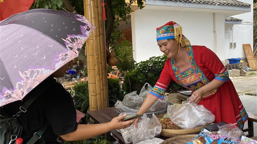 廣西恭城瑤族自治縣蓮花鎮(zhèn)紅巖村村民楊燕紅在家門(mén)口向客人推銷本地特產(chǎn)。